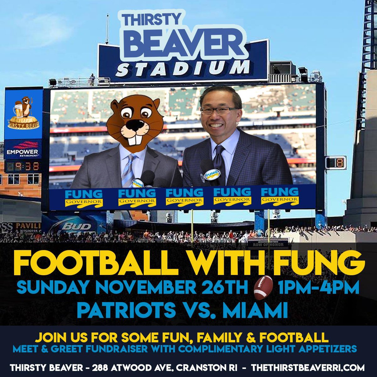 EVENT: Football w/ Fung - Sunday, November 26 1:00pm – 4:00pm - Thirsty Beaver Cranston Come down and join @MayorFung for the game as the Pats destroy Miami! Your $25 donation will help him win the Super Bowl of RI politics next year. https://www.facebook.com/events/1749227255122127/ …pic.twitter.com/Ke2XvWOqBA