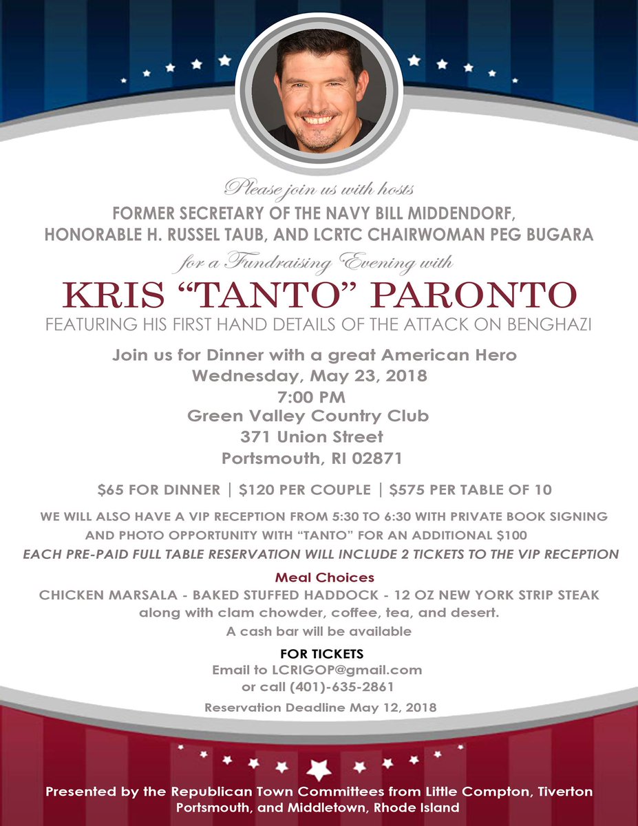 EVENT: A Fundraising Evening with @KrisParonto - Join the Rhode Island @GOP Committees of Tiverton, @PortsmouthRIGOP , Little Compton and Middletown for Dinner with a Great American Hero. Wednesday, May 23rd, Green Valley Country Club.pic.twitter.com/my9uMEU4Yv