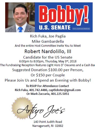 EVENT: An Evening with Bobby Nardolillo for U.S. Senate - Thursday, May 3rd 6:00pm – 8:00pm - Arturo Joe's - Narragansett - @bobby4senate18 @Mark_Zaccariapic.twitter.com/VUV12e02OR