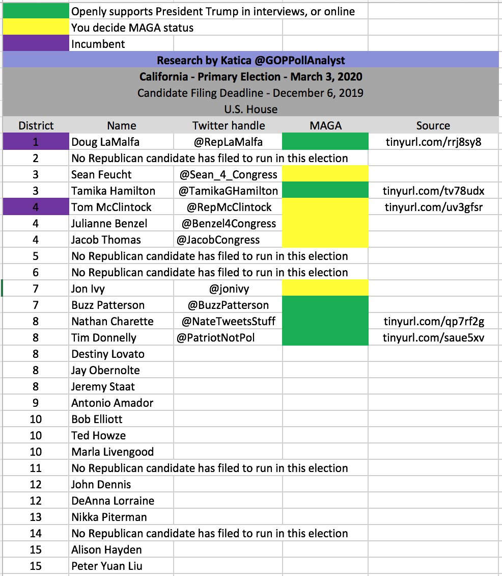 Have a good night all. I will be working on MAGA Candidate Lists this week and weekend. I have currently 115 U.S. House MAGA candidates in my Twitter lists. My Profile > Lists Here's how California is shaping up so far. Night! pic.twitter.com/8Tehi9C2kx
