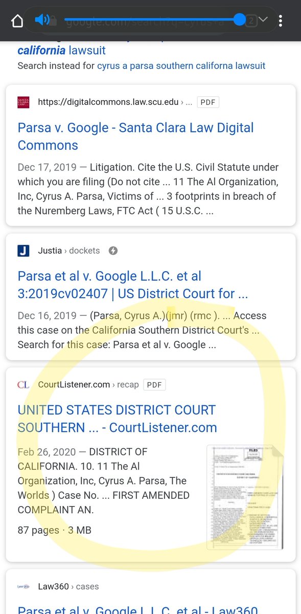 is there any credibility with this information? google "cyrus a parsa southern californa lawsuit" and click the third link that says http://courtlistener.com . it's a 87 page lawsuit that was filed in October 2019 and was approved in February of this year. may be nothing. @Timcast pic.twitter.com/5uygoo0HNm