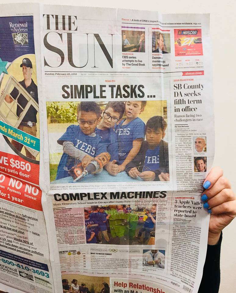 @sbsun newspaper (Sunday's edition) is great news! Congrats to Myers Elementary School's deserving students for earning an invitation to the Rube Goldberg Machine competition in Chicago. Read more here: https://www.sbsun.com/2018/02/16/rialto-unified-students-cereal-pouring-contraption-wins-them-invitation-to-rube-goldberg-machine-competition-in-chicago/ …pic.twitter.com/7dTciXCy67