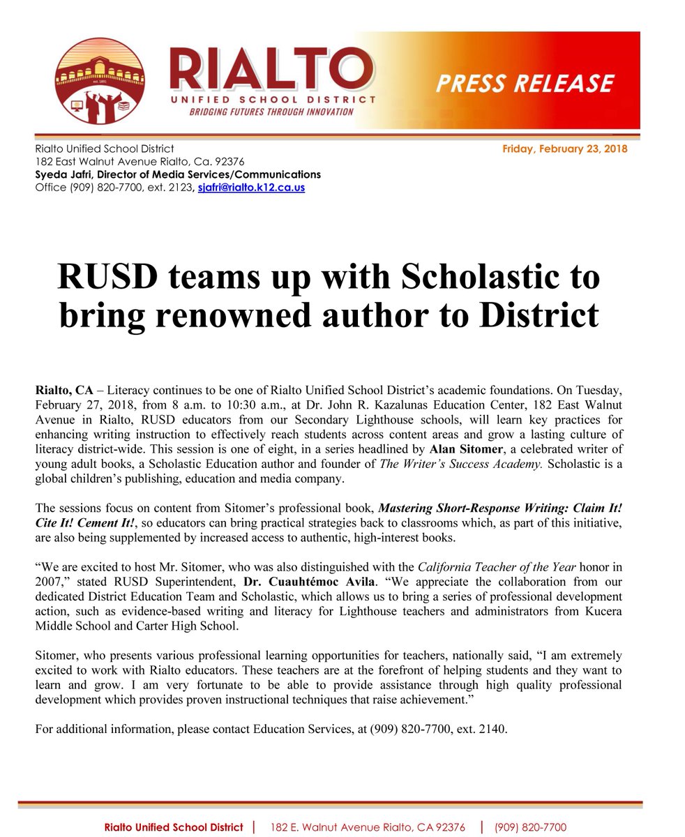 * Press Release * RUSD teams up with Scholastic to bring renowned author to Districtpic.twitter.com/Qy33lZPIyX