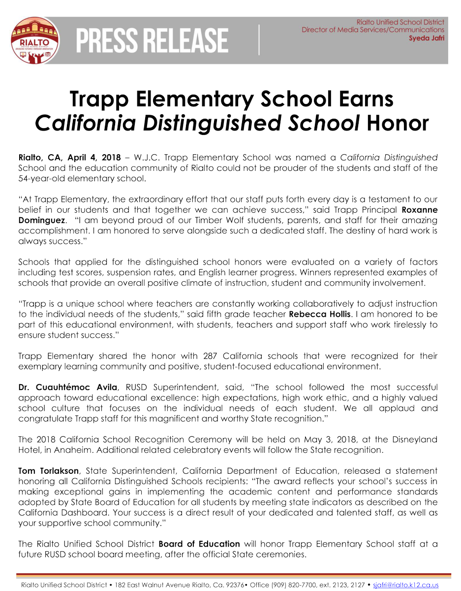 *Press Release* Trapp Elementary School Earns California Distinguished School Honorpic.twitter.com/578vgKCFDG