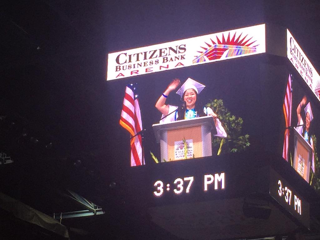 Macy Matsukawa, RHS Salutatorian, waves enthusiastically at her family and friends in the audience #RialtoGrads2015pic.twitter.com/dnFZ9Ve0Kg