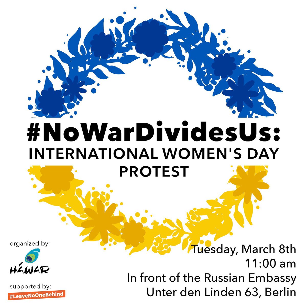 #Weltfrauentag sehr viele Menschen zu unserer Kundgebung vor der russischen Botschaft um 11:00 Uhr erscheinen, die wir gemeinsam mit@HawarHelp und@lnob2020 ausrichten. Gegen Putins Angriffskrieg auf die Ukraine. Because#NoWarDividesUspic.twitter.com/RKnZxMSWg0