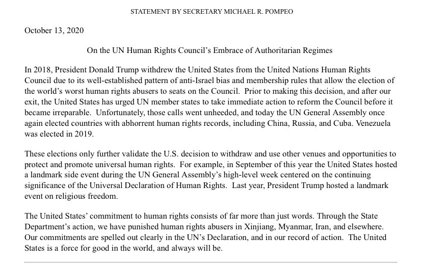 These countries will serve on a UN council tasked with “the promotion and protection of all human rights around the globe.”https://twitter.com/michelekelemen/status/1316079494143381505 …