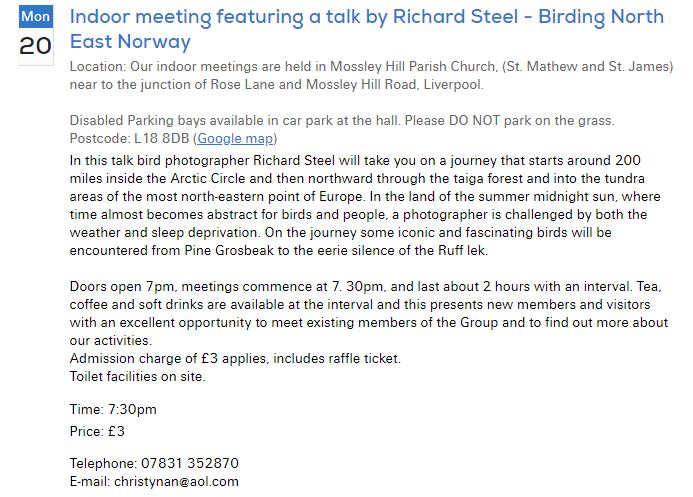 Giving a talk to RSPB Liverpool on Monday night on my photography trips to NE Norway. All welcome... Details on image below.pic.twitter.com/LEcxsBCBTF