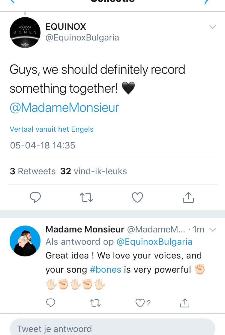 Er bloeit wat moois op tussen de Bulgaarse en Franse inzending voor het Eurovisie Songfestival. Samen een nummer opnemen. Ze kwamen elkaar tegen bij een pre-party in Londenpic.twitter.com/tUcmdO2TQS