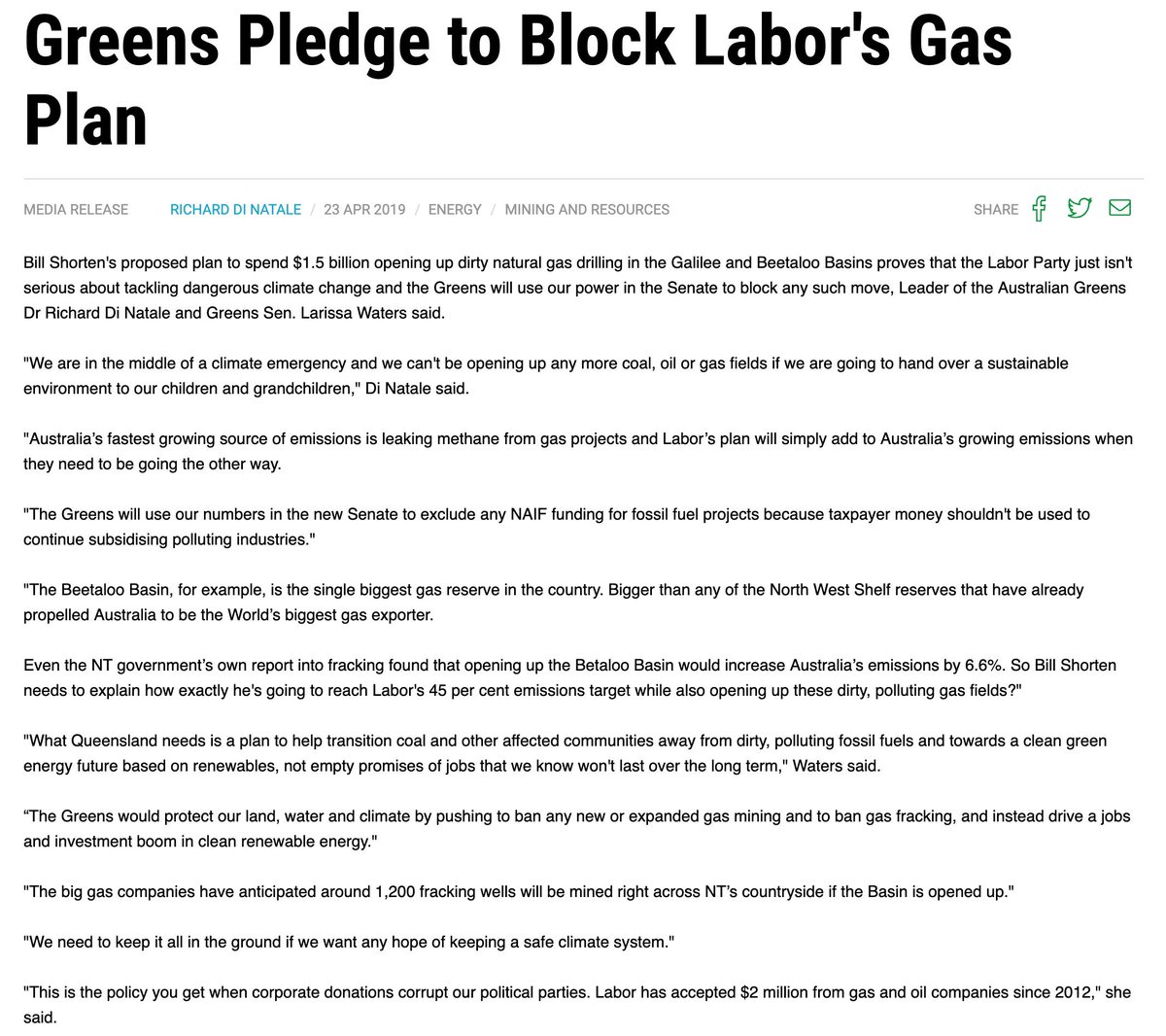 So disappointing. The Beetaloo Basin is the biggest gas reserve in the country. This is the policy you get when corporate donations corrupt political parties. Labor has accepted $2m from gas & oil companies since 2012. Greens will use our power in the Senate to block this move.https://twitter.com/simonahac/status/1120676343996223488 …