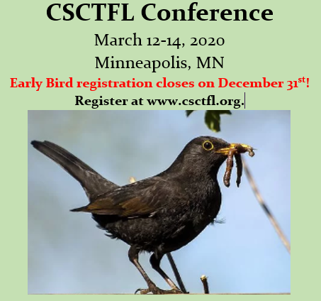 This year's keynote speaker, Dr. Katy Arnett, will focus on inclusion both in her formal address and in two additional workshops. Join us in Minneapolis March 12-14th. Regular registration closes on Feb. 15th. https://csctfl.wildapricot.org/