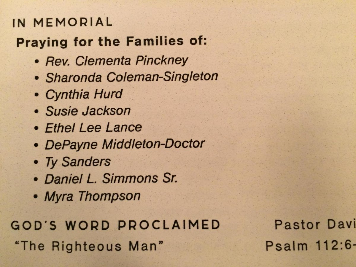 The program at the white Southern Baptist church this morning, next door to Emanuel AME.pic.twitter.com/Z09Qssy1nk