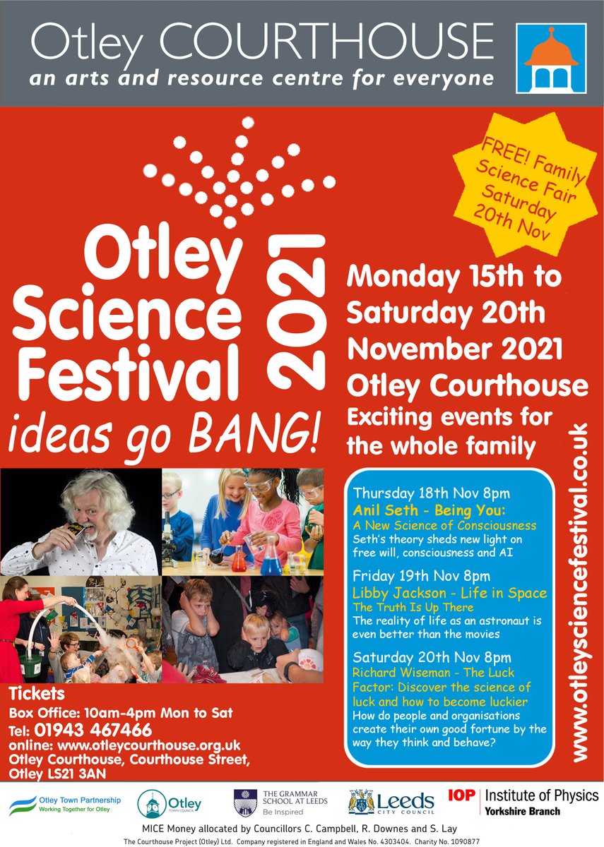 @otleyscience with our ever popular Science Fair. 10am - 4pm. Entry is free. Then at 8pm,@RichardWiseman joins us for his talk "The Luck Factor" Tkts are £18 for our evening event and can be purchased in advance or on the door. https://bit.ly/2YApOLq pic.twitter.com/1pAptuiMfR