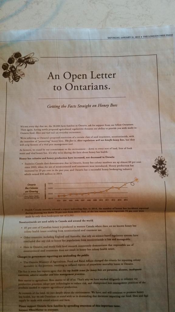 Found full page letter in my paper on #BeesMatter today - good info from farmers and industry http://www.beesmatter.ca pic.twitter.com/Du50Fis1pq