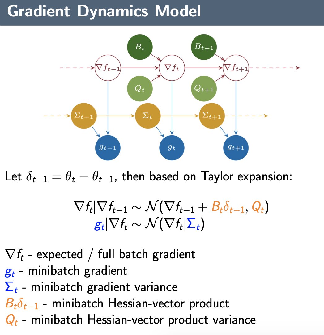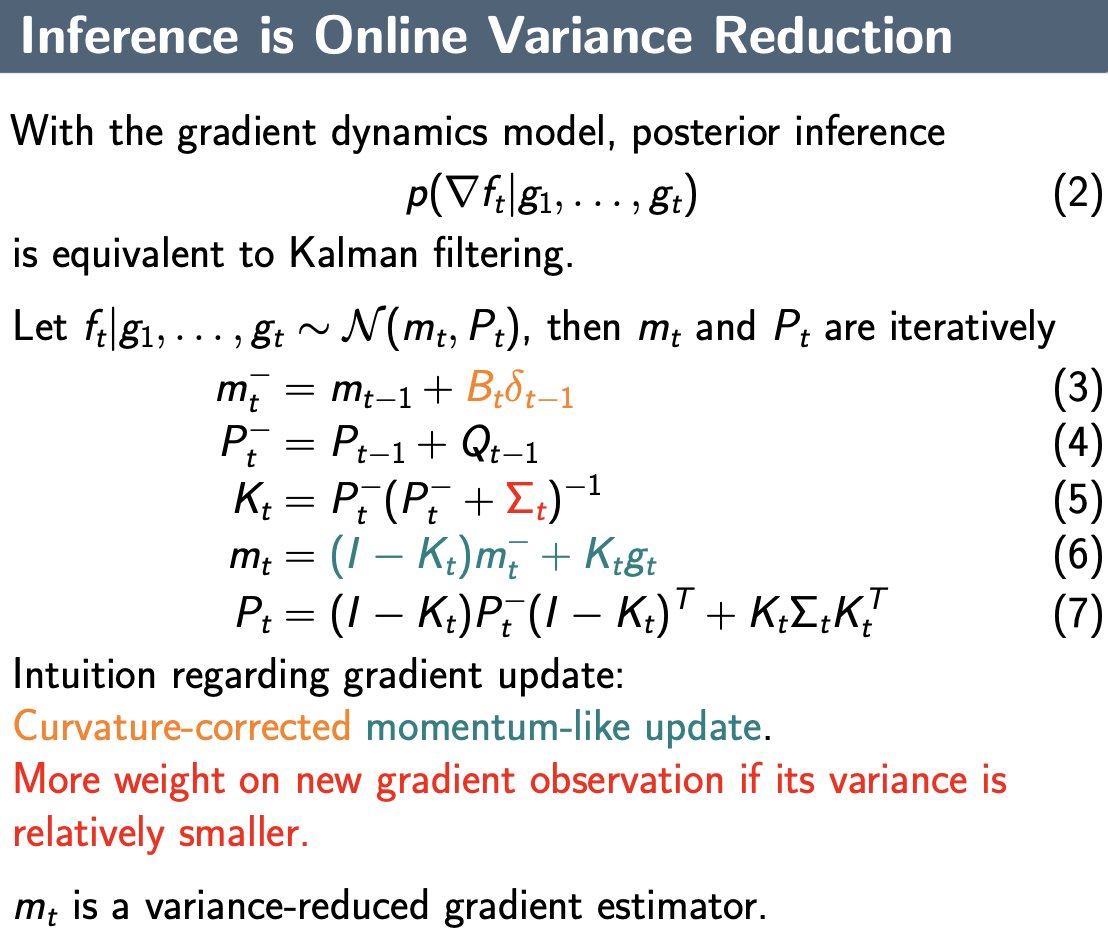 Inference under our model is equivalent to Kalman filtering. Curvature-corrected momentum-like updates naturally appears, and the variances determine how much we should trust our gradient samples. This results in an online variance reduction algorithm.pic.twitter.com/HtKAlewHhg