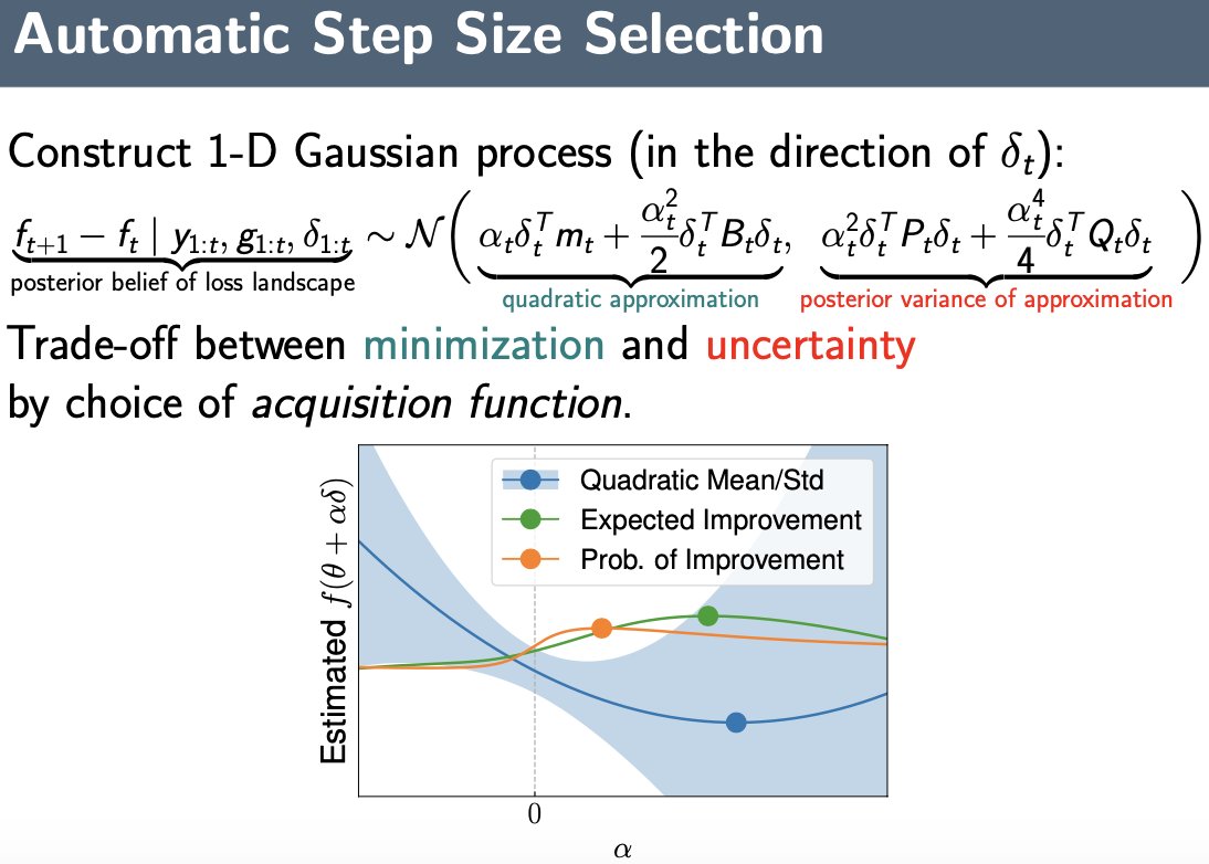 What else can we do with the variance estimates at hand? We can build a 1D Gaussian process for estimating the objective function, in any descent direction. Adaptive step sizes can be chosen to trade-off between minimization and uncertainty!pic.twitter.com/yOmGFm0Ylt