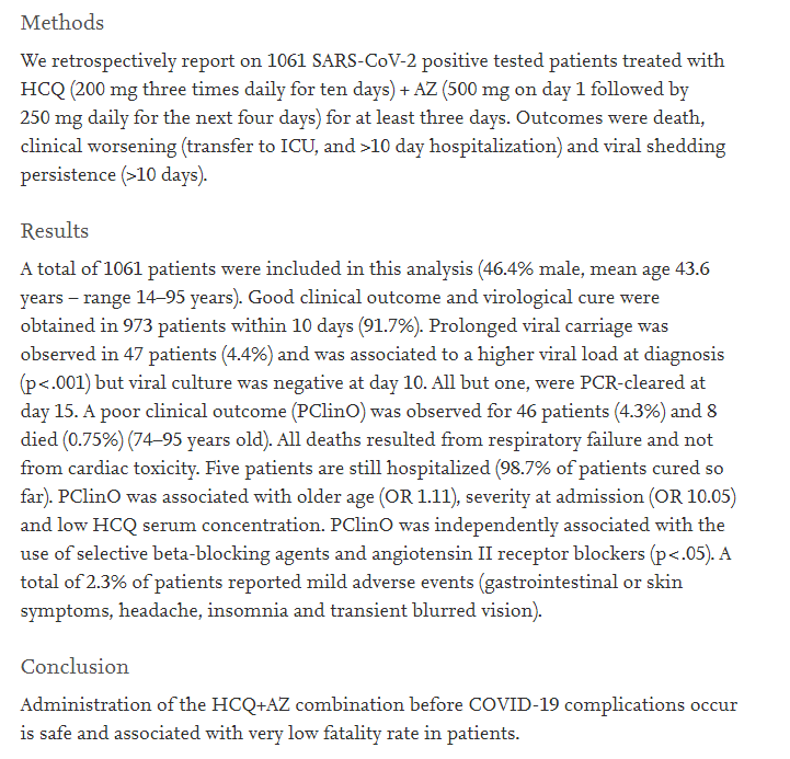 Publication de notre article : analyse retrospective du traitement de 1061 patients par HCQ/AZ. Publication of our paper : early treatment of COVID-19 patients with hydroxychloroquine and azithromycin: A retrospective analysis of 1061 cases in Marseille https://www.sciencedirect.com/science/article/pii/S1477893920302179?via%3Dihub …pic.twitter.com/VYWaBdfVL3
