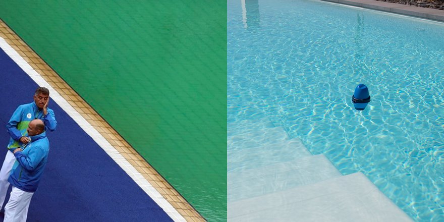 You need to take that huge green banner out of the diving pool. The yellow ink is turning the water green.