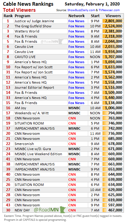 Cable News Ratings Mon Feb 3 Average Viewers 6 am to Midnight