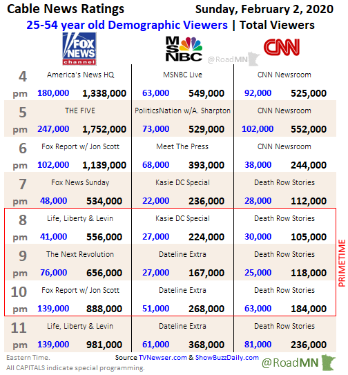 Cable News Ratings Sunday Feb 2 Average Viewers 4 pm to Midnight Demo | Total