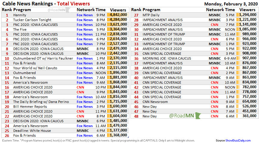 @TheFive@BretBaier +@marthamaccallum (FNC/6-8p)@seanhannity@TuckerCarlson Caucus/CNN 10-11p Smallest:@chucktodd Caucus/MSNBC/7p Caucus/CNN/5p Chart courtesy@RoadMNpic.twitter.com/QH9ZiNwmn2