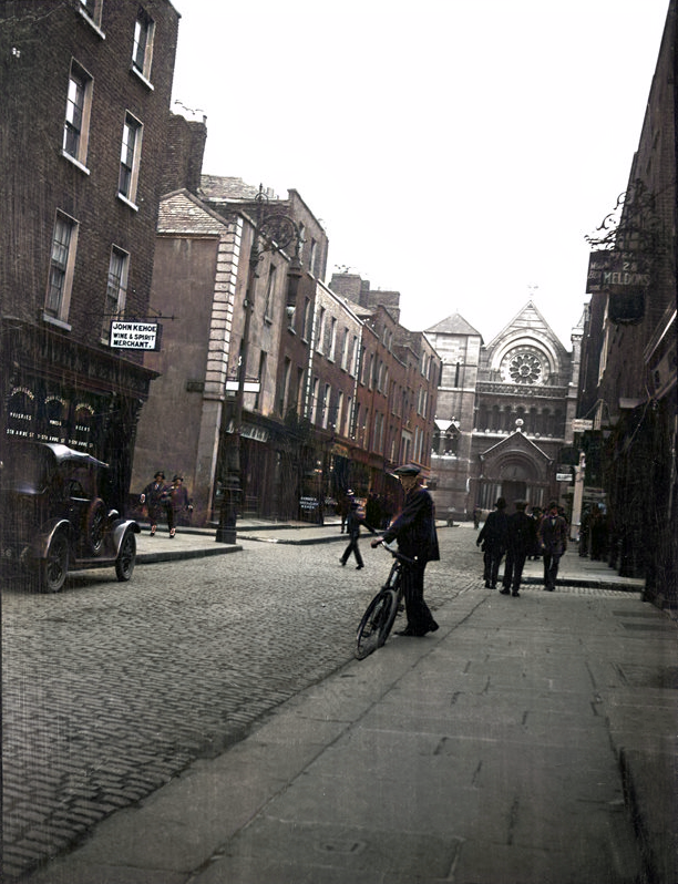 Re-animating the lost history of Anne Street South. My colourised and restored 1925 photo of Anne Street South in Dublin City featuring Kehoe's Pub on the left. The original black & white photo forms part of National Folklore Collection.