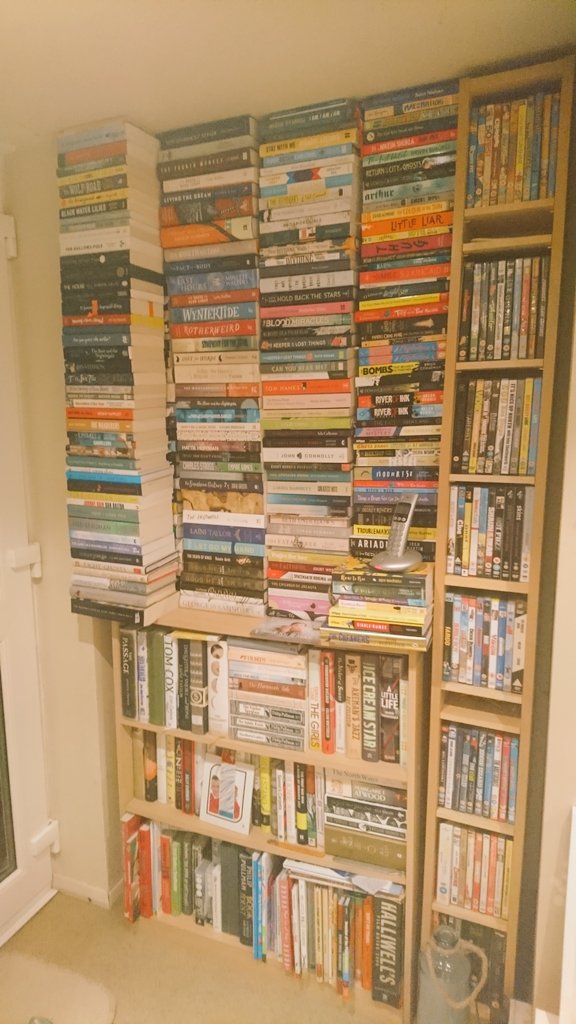 The trick to securing teetering piles of books is to have enough to be able to wedge them in firmly against the ceiling. (This is about a quarter of my collection)pic.twitter.com/eAExCuOWJz