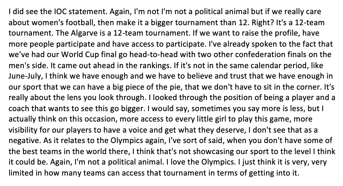 Asked FIFA adviser Jill Ellis about Olympic chiefs denouncing biennial World Cup plans & she questioned women's Oly football having only 12 teams: "When you don't have some of the best teams in the world there I think that's not showcasing our sport to the level I think it could" https://twitter.com/RobHarris/status/1449481228009320453 …pic.twitter.com/7YtkIOcf0S