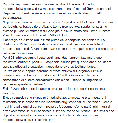 La strage lombarda nasce ad Alzano a metà febbraio. La situazione era più grave di Codogno, Regione Lombardia e dirigenti locali leghisti lo sapevano ma hanno taciuto per non chiudere le aziende. Ne ho scritto su