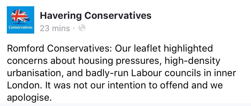 Romford Conservatives have acted - I asked them to apologise and withdraw the leaflet and they did so.pic.twitter.com/iAVOuPnlxM