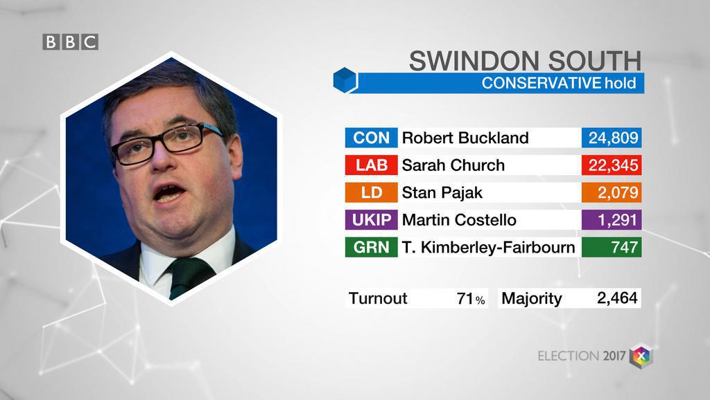 @RobertBuckland re-elected as MP for#Swindon South. CON 24,809 LAB 22,345 LIB DEM 2,079 UKIP 1,291 GREEN 747 Turnout 71%.#GeneralElection