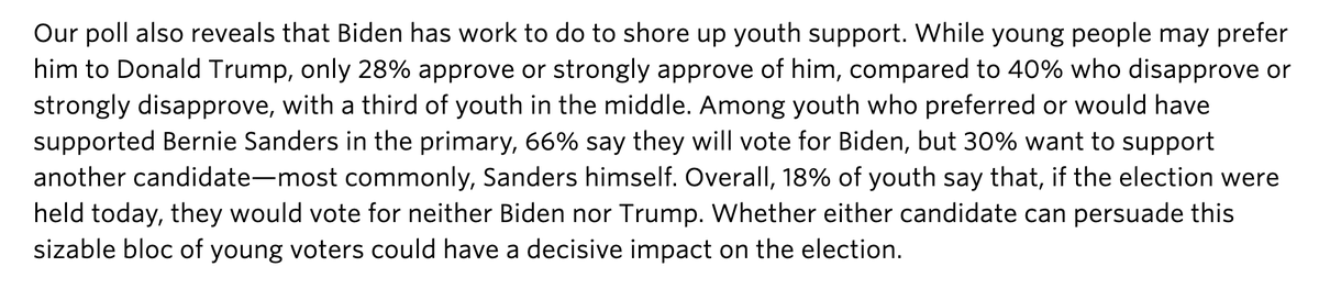 Unsurprisingly, the poll gives Biden a big lead over Trump, 58% to 24%, but also finds some enthusiasm issues for the Democrat. 30% of young Sanders supporters want to vote for someone other than Biden or Trump. https://circle.tufts.edu/latest-research/poll-young-people-believe-they-can-lead-change-unprecedented-election-cycle …pic.twitter.com/Q0X35ThoJK