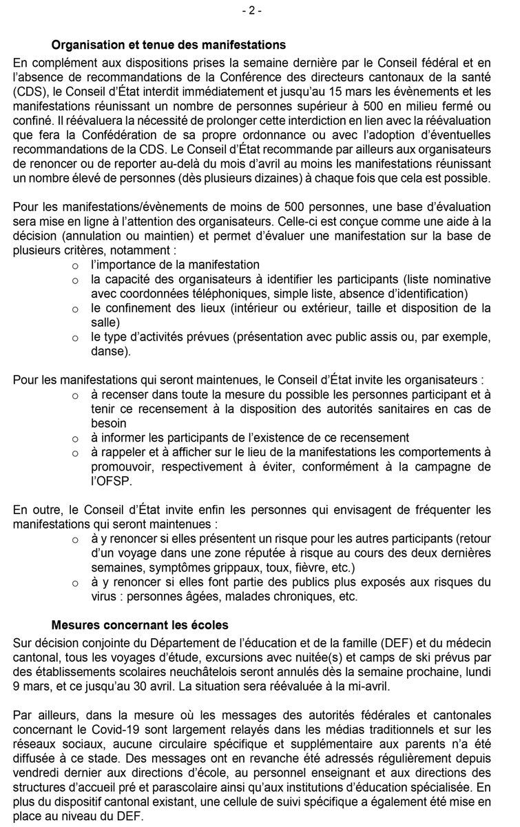 Renforcement du dispositif cantonal: manifestations limitées à 500 personnes, courses scolaires et camps de ski à la trappe. #covid19https://twitter.com/Etat_Neuchatel/status/1235207990564835328 …