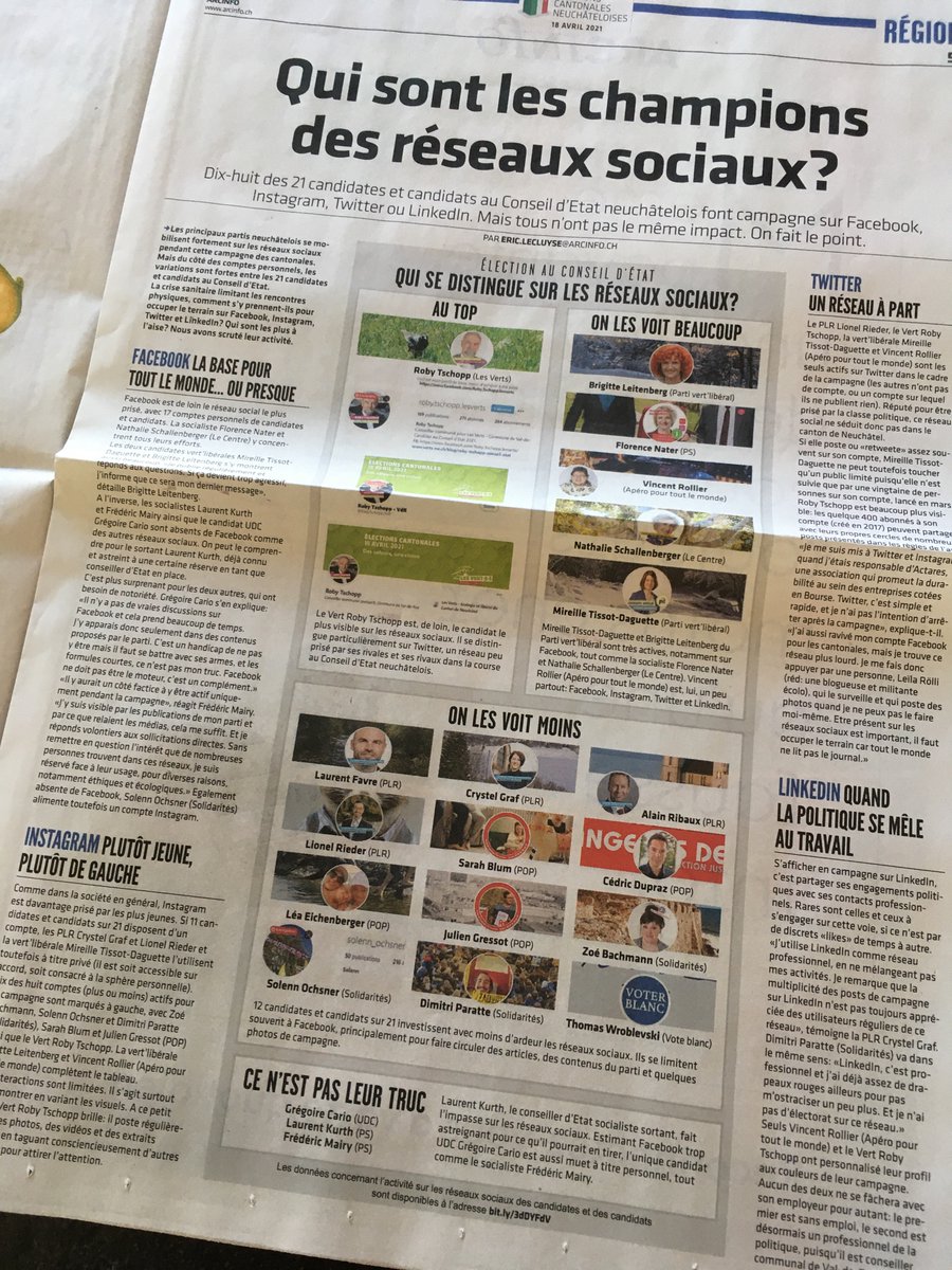 "Qui sont les champions des réseaux sociaux?" titre @arcinfo 🗞️ Premier indice: le photomontage d'illustration n'est pas composé au hasard 😆 Sérieusement, bonne synthèse d'un pan de la campagne électorale #covid-compatible. @VertsNE #cantonalesNE2021 #vagueverte #VertesNE2021https://twitter.com/arcinfo/status/1379844067232604161 …