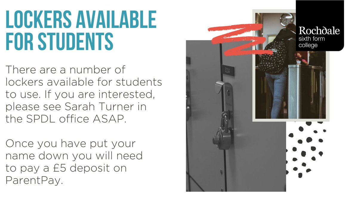There are a number of lockers available for students to use. If you are interested, please see Sarah Turner in the SPDL office ASAP. Once you have put your name down you will need to pay a £5 deposit on ParentPay.pic.twitter.com/LknMpVGO0h