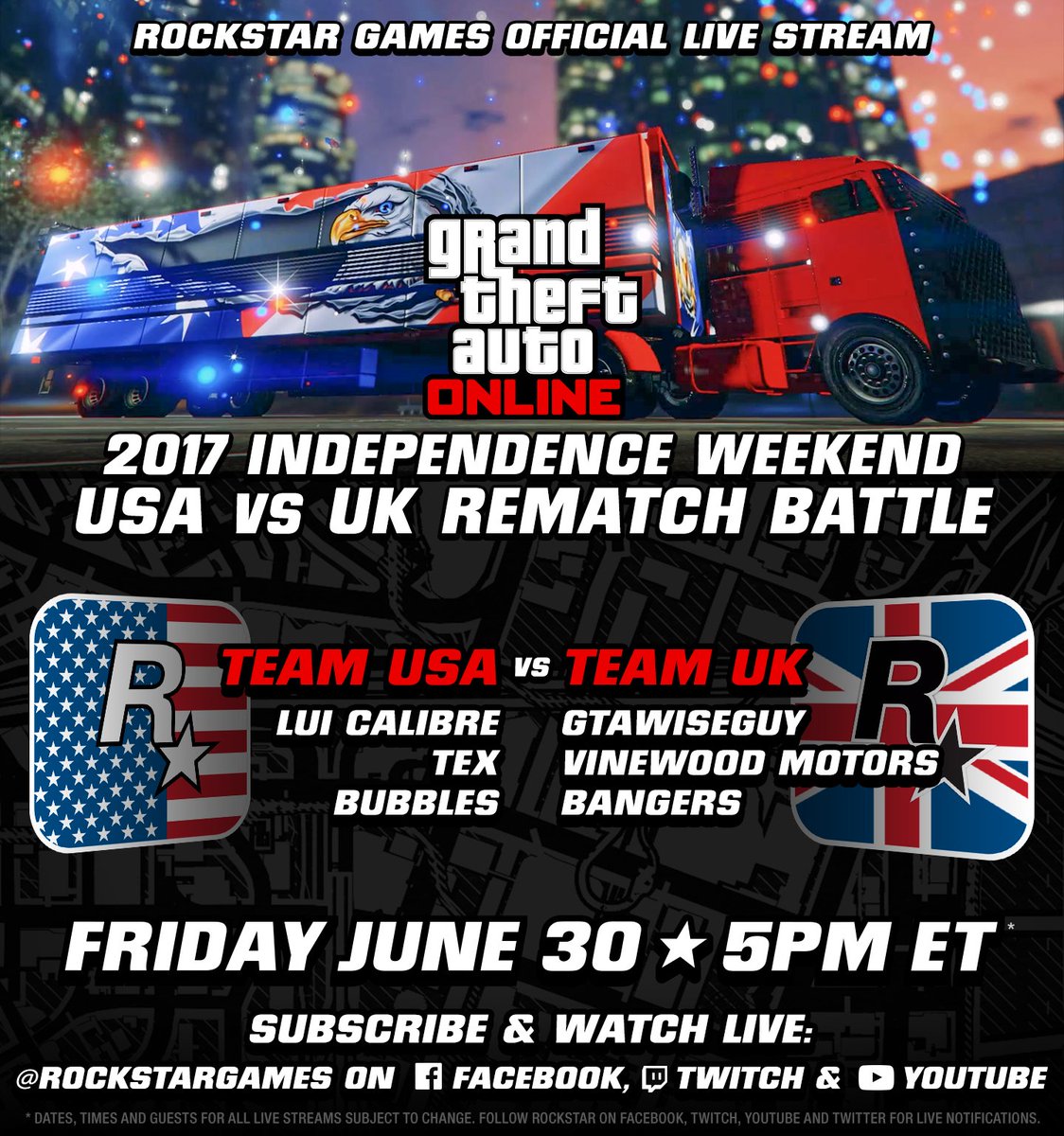 The USA vs UK #GTAOnline Independence Weekend Stream at https://www.twitch.tv/rockstargames https://www.youtube.com/watch?v=Km2mez9tDUU … https://www.facebook.com/rockstargames/ pic.twitter.com/F7L93Di2RnThanks. Twitter will use this to make your timeline better. Undo -