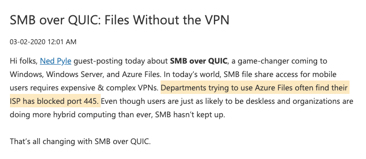 I can't evaluate the impact of this SMB over QUIC vector (if there is one). Could someone with more insight step forward & tell us if this means that blocking outgoing port 445 isn't enough to protect our SMB clients? https://techcommunity.microsoft.com/t5/itops-talk-blog/smb-over-quic-files-without-the-vpn/ba-p/1183449 …pic.twitter.com/Ln7481uzG4