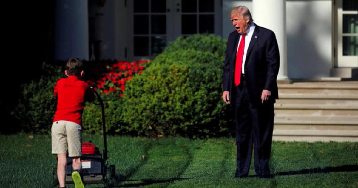 His love-child cuts Tangerine Thin-hands' lawn while ignoring yelling gibberish.