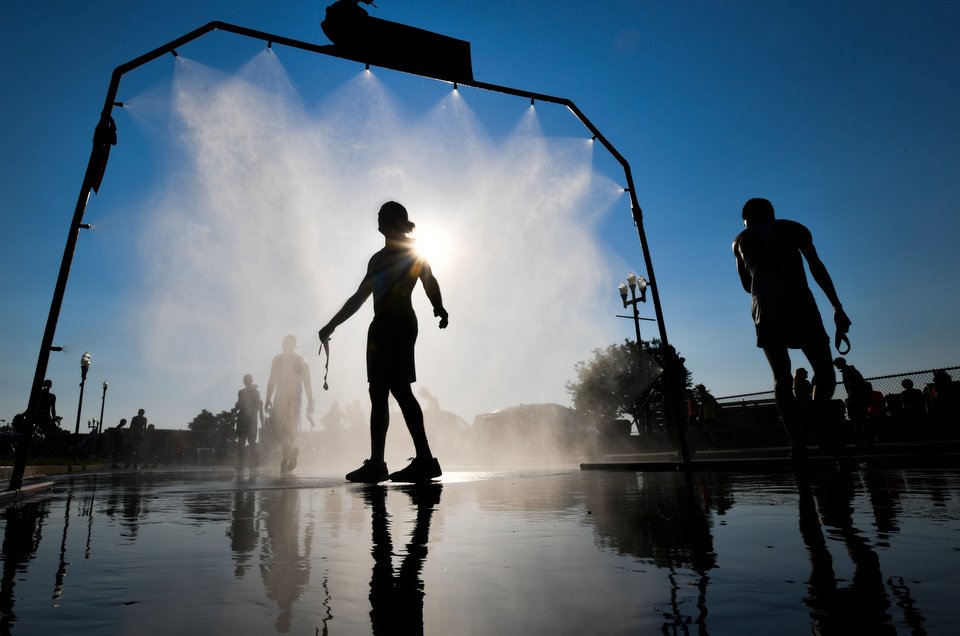 A cool sprinkler becomes relief for runners in