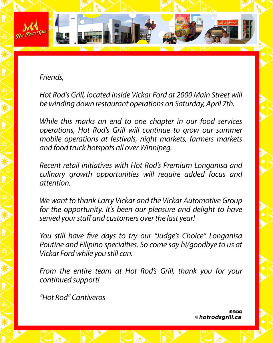 Saturday is the last day Hot Rod's at Vickar Ford will be open. Join us on Saturday for our LAST-DAY-SILOG promotion! We're going to cook, sell whatever we have left in our coolers!pic.twitter.com/B1Gb7H0hHB
