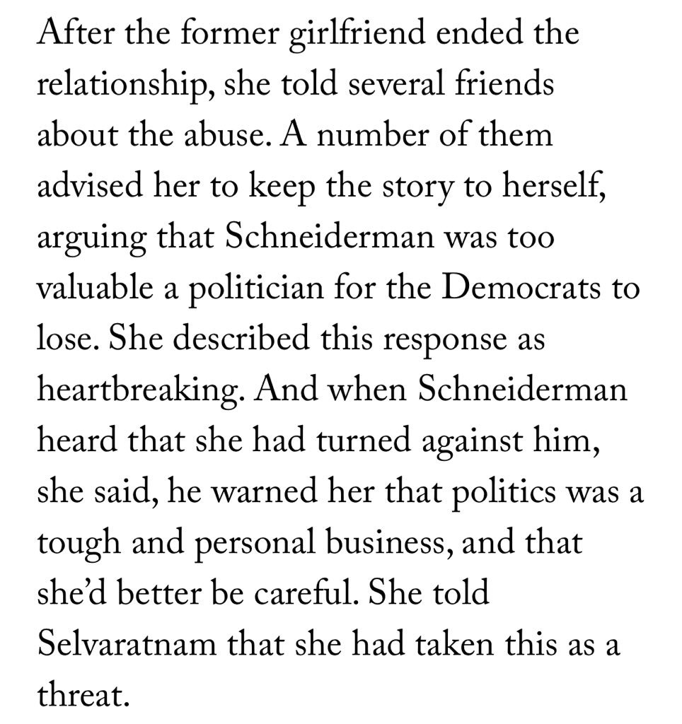 Some of the women also said that they hesitated to report their allegations, or that friends advised them to remain silent, due to Schneiderman’s status as an influential and well-regarded figure in democratic politics.pic.twitter.com/D8GzvNdtk2