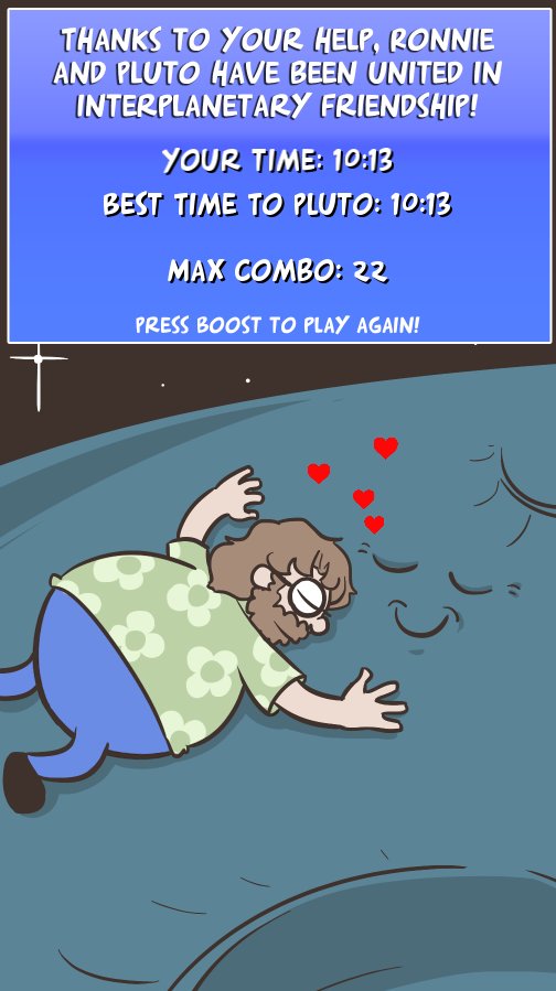 Fun game! @RonnieFilyaw I instantly died the first time because I didn't know what the game was about at first but then I just blazed through to the end. I love the mental image of Ronnie going "pluto is sad" then cannonballing through the cosmospic.twitter.com/P8ejixTRyB