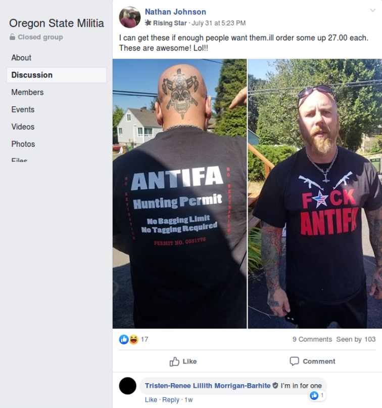 Inside that closed facebook group, there is evidence of Barhite's hatred for anti-fascists. She asks to purchase a shirt advocating for the murder of anti-fascists.pic.twitter.com/jCYRkbxD4Q