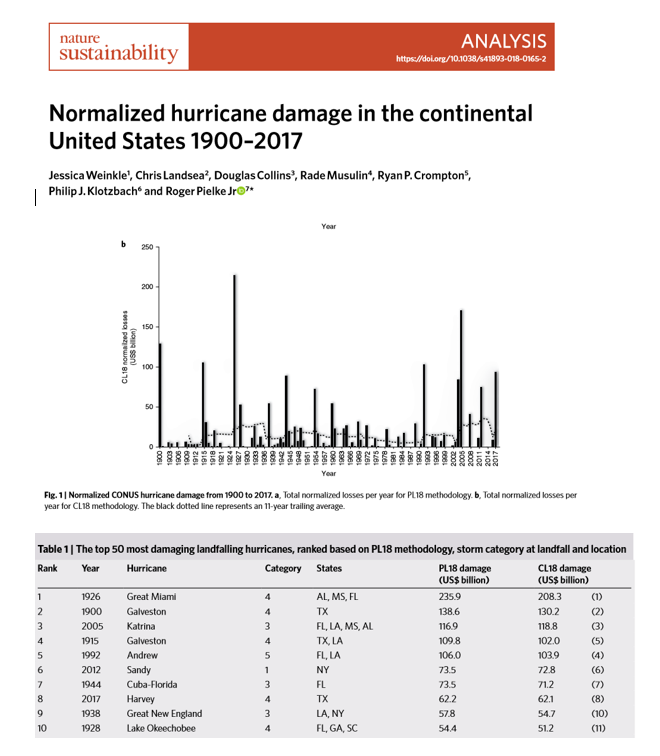 Omdat klimaat laatste 20 jr (VT) niet significant is opgewarmd, is focus van alarm toeters op weerextremen. Helaas recente studie van 7 klimaatwetenschappers : geen toename van schade en frequentie orkanen laatste 117 jr. Grootste orkaan ramp : 1900 en 1926. Geen korrelatie CO2.pic.twitter.com/f60V69fv8Q