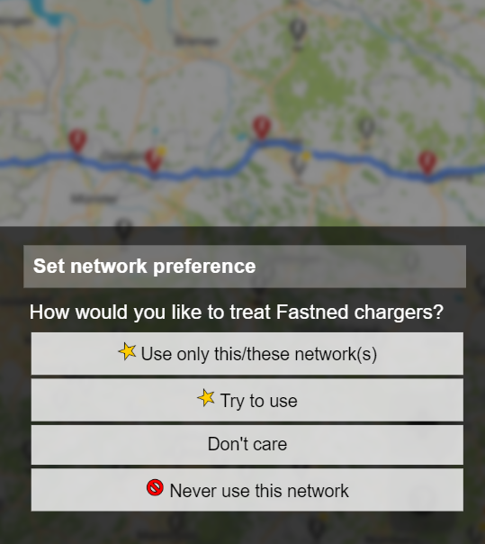 As more and more fast chargers appear, it's nice to be able to selected which ones you like and plan with those. We just released better control of charger networks preferences! Click a charger icon and select "Prefer or avoid..."pic.twitter.com/Mrnr1Zjycw