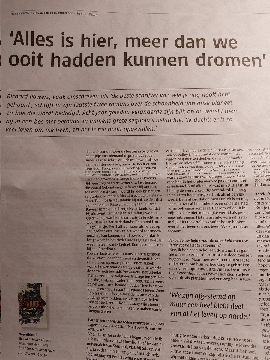 #bookerprize2021: Richard Powers. Maar wat een schrijver. Maurice Hoogendoorn@MauriceHoog sprak met hem voor het Nederlands Dagblad. Ik las begin 2021 Powers' vorige, 'Tot in de hemel'. Ook daarin speelden de torenhoge sequoia's een grote rol. http://www.nd.nl pic.twitter.com/OpmFSulsmu