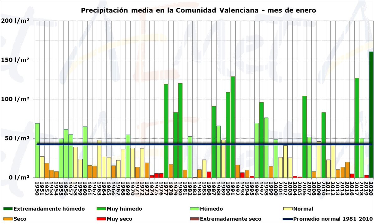 #ResumenClima. Enero de 2020, mes extremadamente húmedo y cálido en la Comunidad Valenciana. La temperatura media, 8.3 ºC, es 0.5 ºC superior que la de la climatología de referencia, y la precipitación acumulada ha sido 161.5 l/m2, que es casi cuatro veces la del promedio normal.pic.twitter.com/ozdoJghJwm