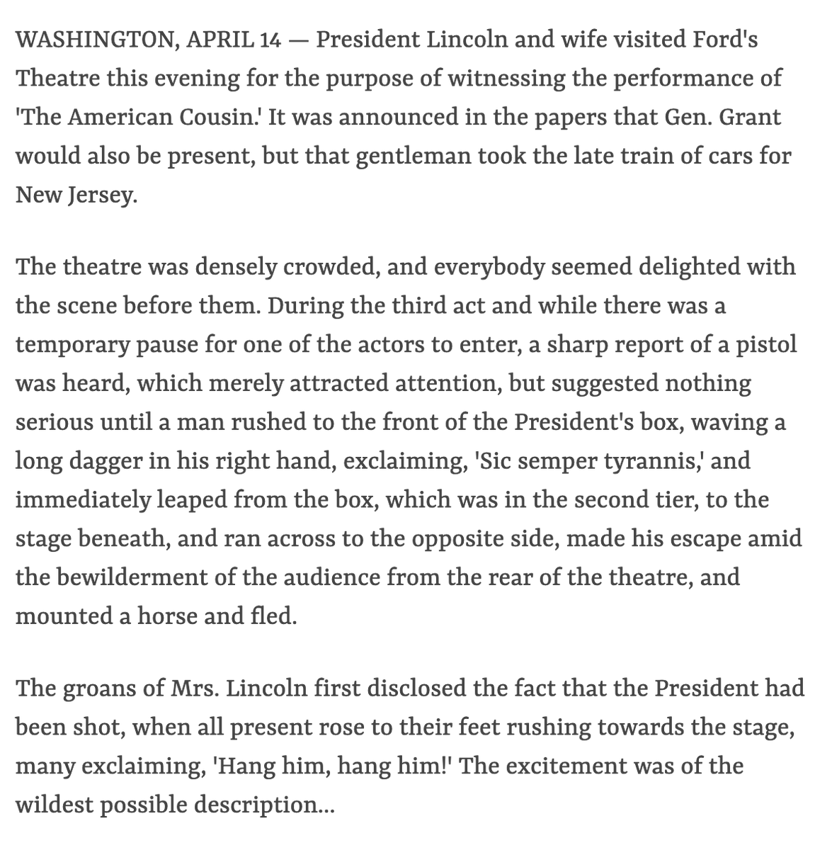 Lincoln walks in, Grant couldn’t make it, and a few sentences later, the president was shot.https://twitter.com/ByMikeBaker/status/1250459543173099521 …