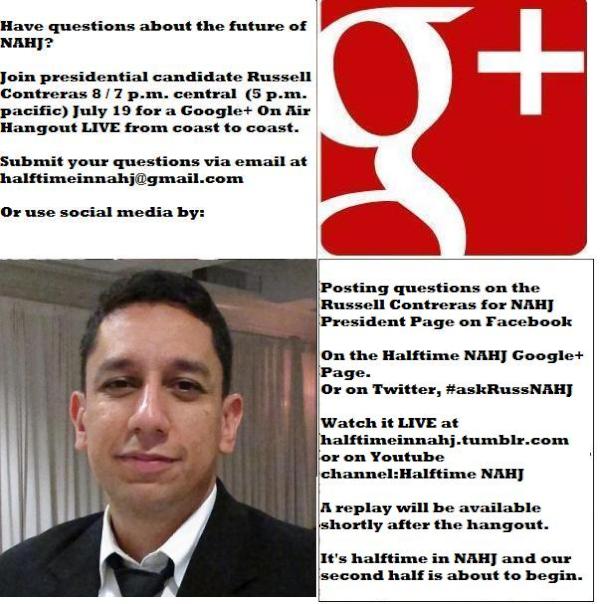 RT @HalftimeinNAHJ What's the future of NAHJ? Join @RussContreras 4 live Google+ hangout Thrs #askRussNAHJ #electNAHJ12pic.twitter.com/B587zxuT