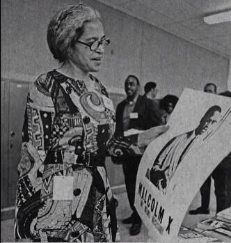 Here's Rosa Parks holding a poster of Malcolm X. Happy birthday, #RosaParks #BlackHistoryMonth